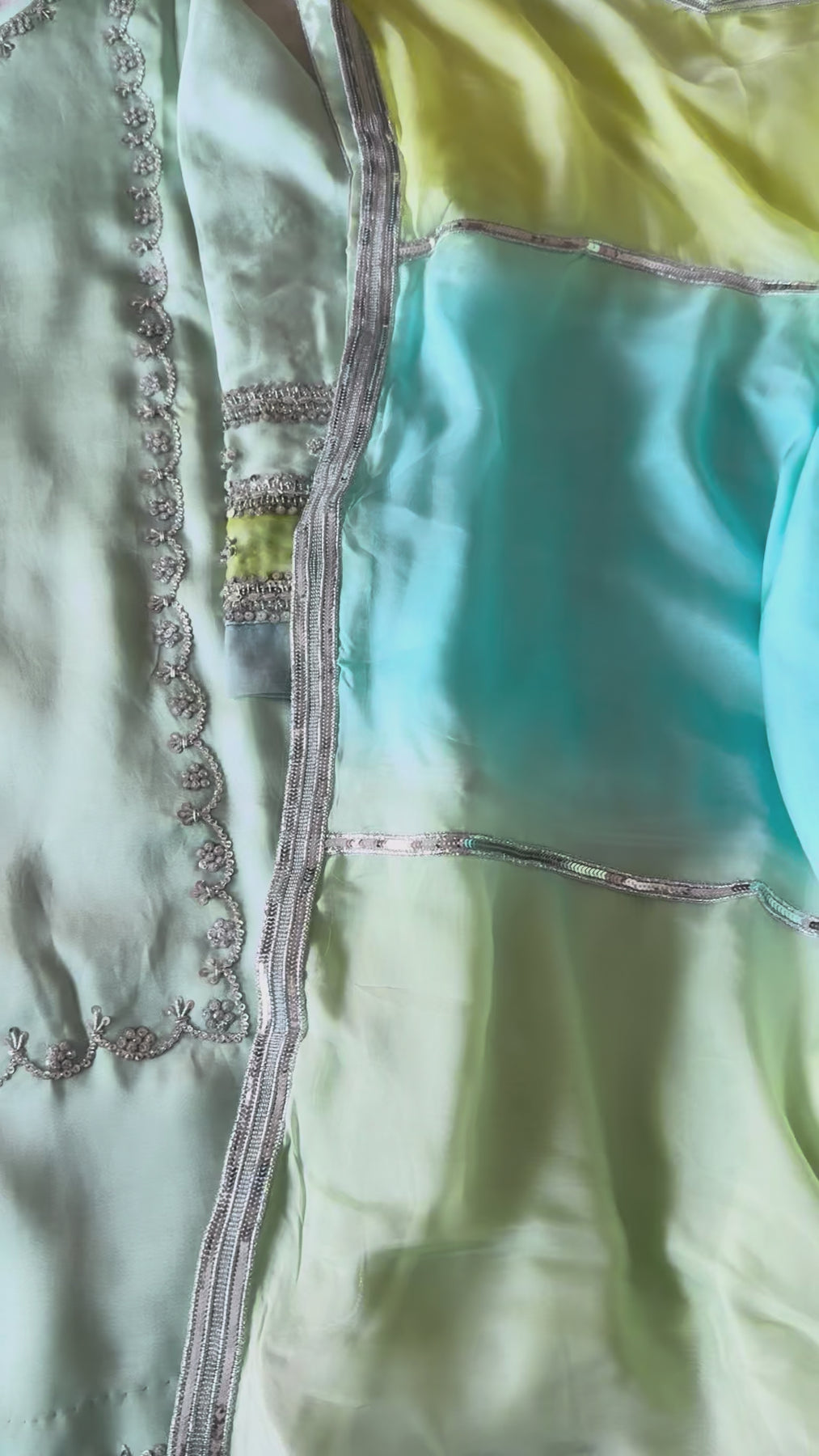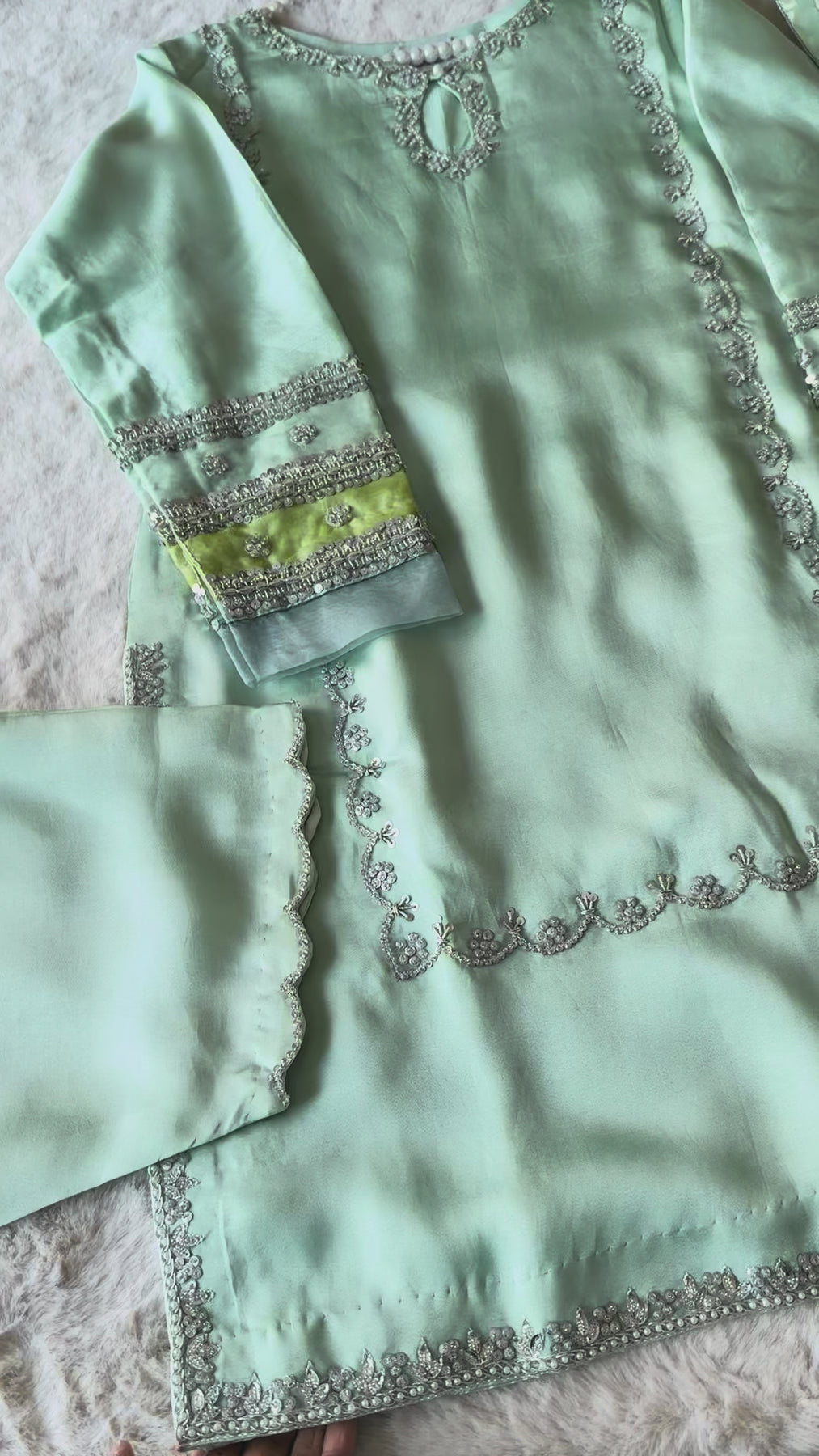 Make a stunning impression in this statement piece in pure tussle silk fabric, featuring exquisite hand work detailing on the neck,front,daaman and sleeves that adds a touch of elegance. Pair it with a matching tassel silk farshi shalwar and pure medium silk dupatta with 3 tone color and lace border on all 4 sides to complete the look of this attire.