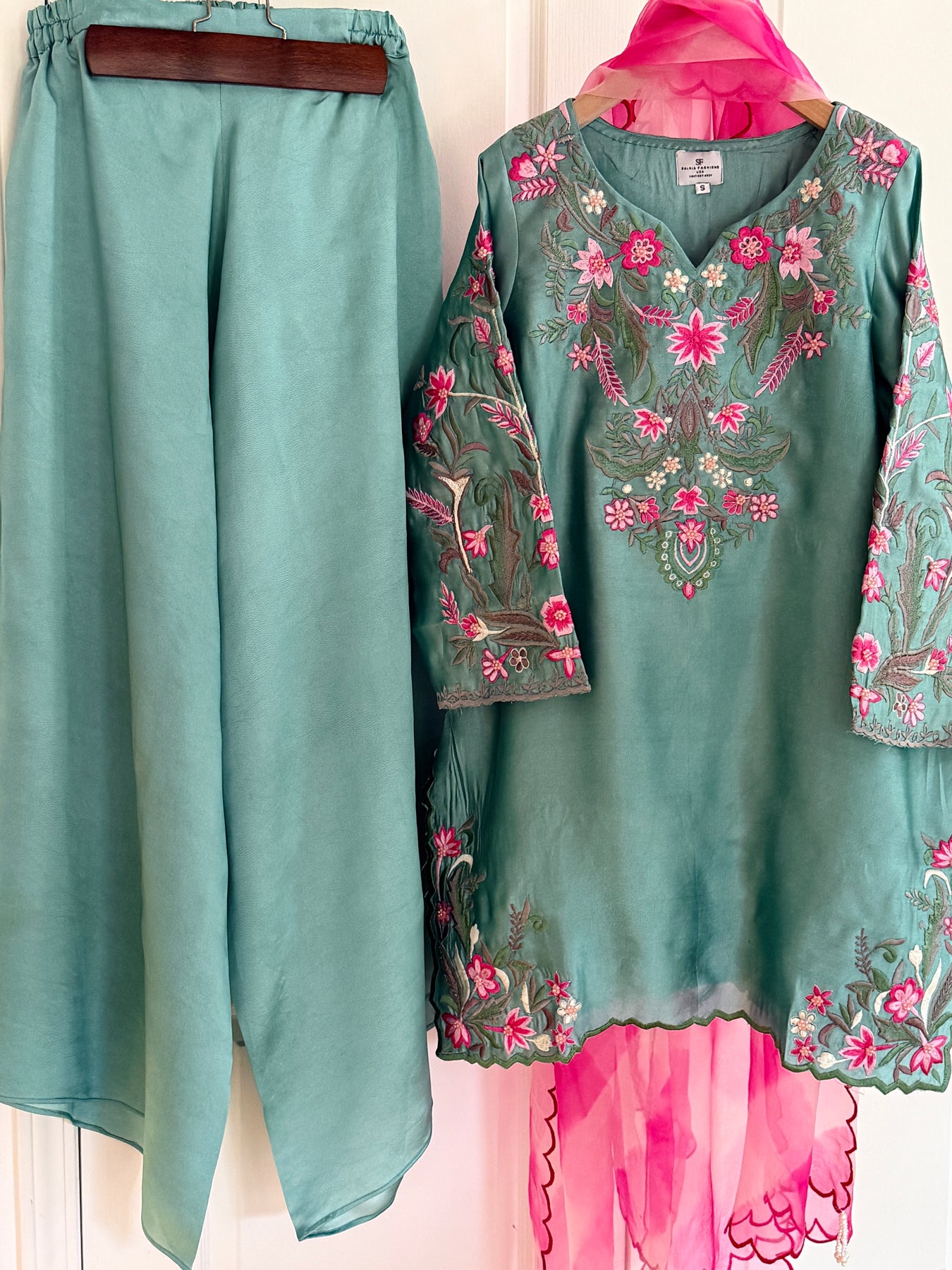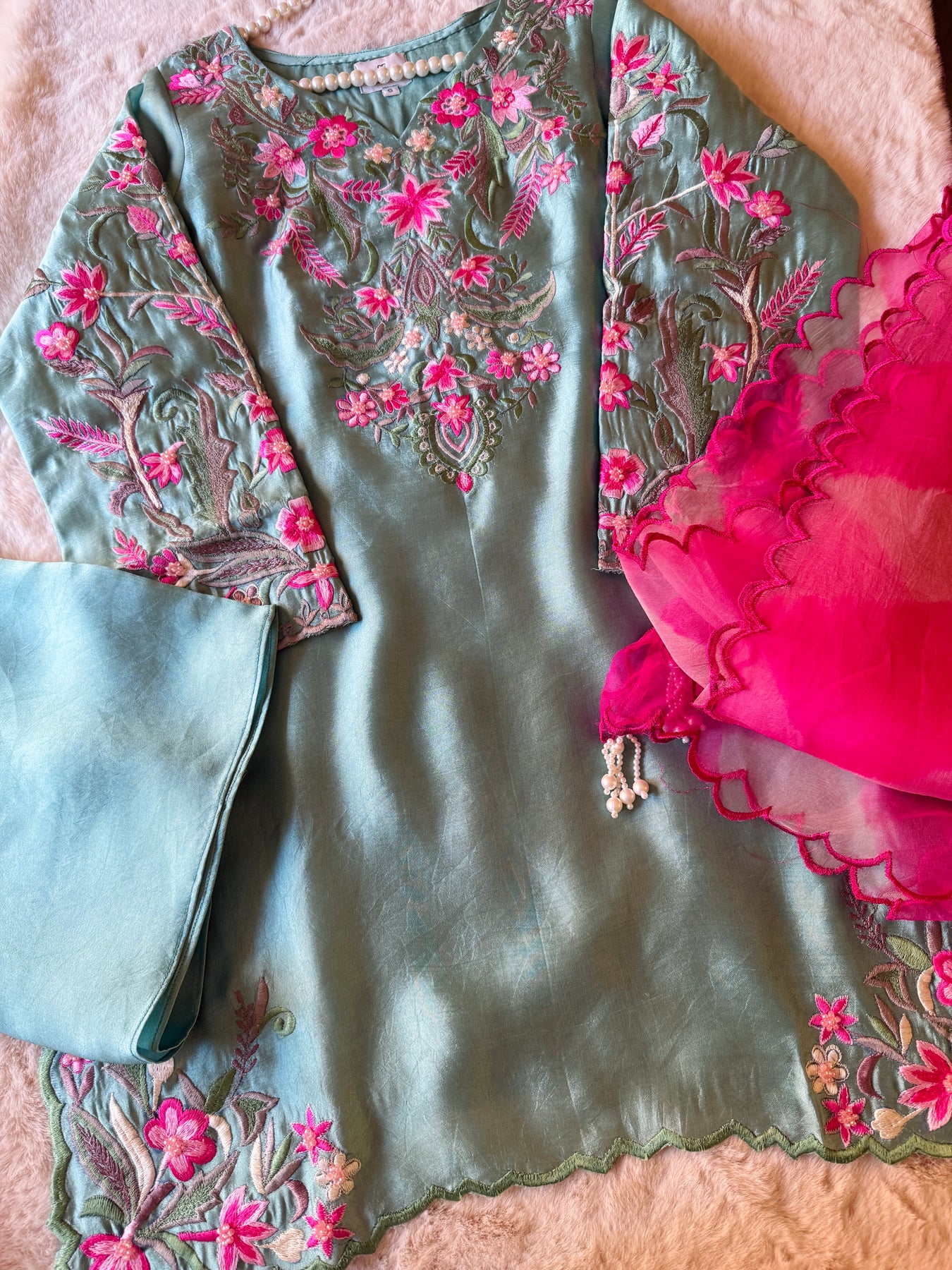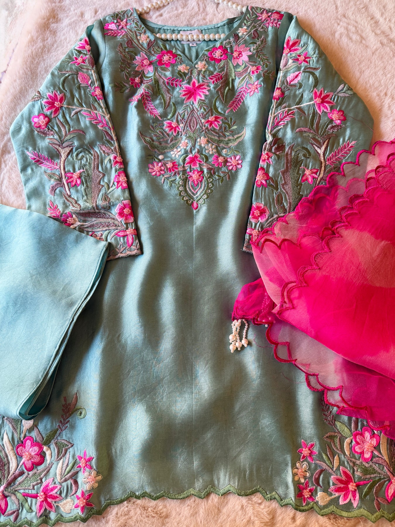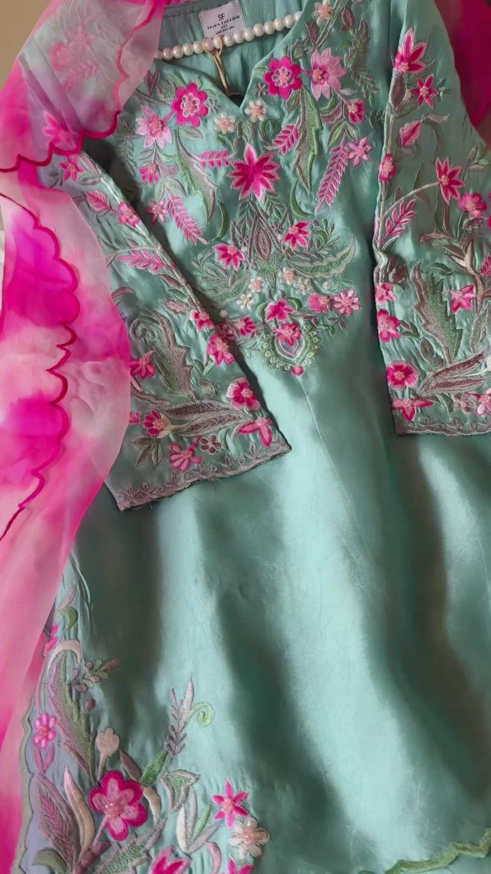 Crafted from pure sheesha raw silk, this standout ensemble showcases intricate multicolor thread embroidery across the front,sleeves and daaman, enhanced by intricate hand work detailing for refined sophistication. Complete the look by pairing it with the coordinating most trending pure sheesha silk box pleated pants and a pure organza dupatta featuring stunning leharia print in a contrast color.