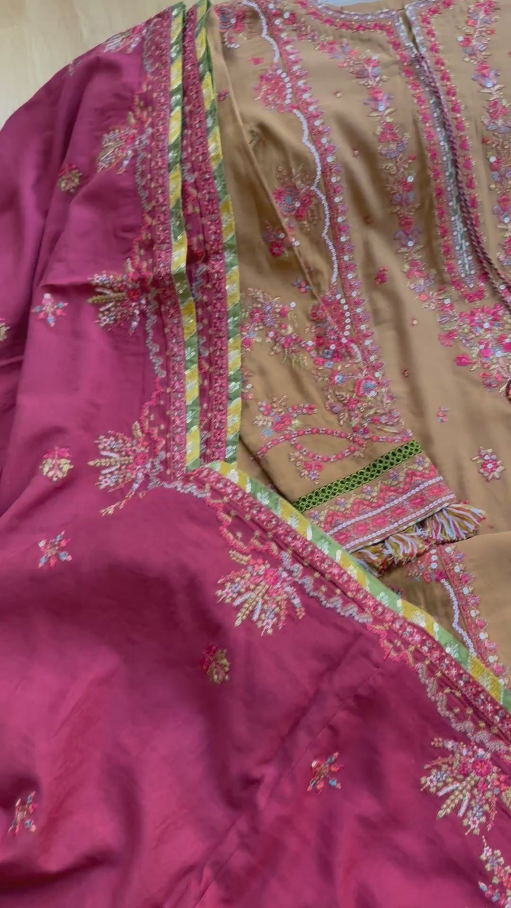 Step into unparalleled elegance with this exquisitely detailed ensemble,where every stitch tells a story of grace and refinement.The intricate embroidery on the shirt's front and back panels,bordered sleeves,and delicately crafted shawl come together to create a harmonious design that captures the essence of understated beauty.Paired with matching trousers featuring subtle embroidered accents,this outfit is an impeccable choice for elevating your style this winter season.