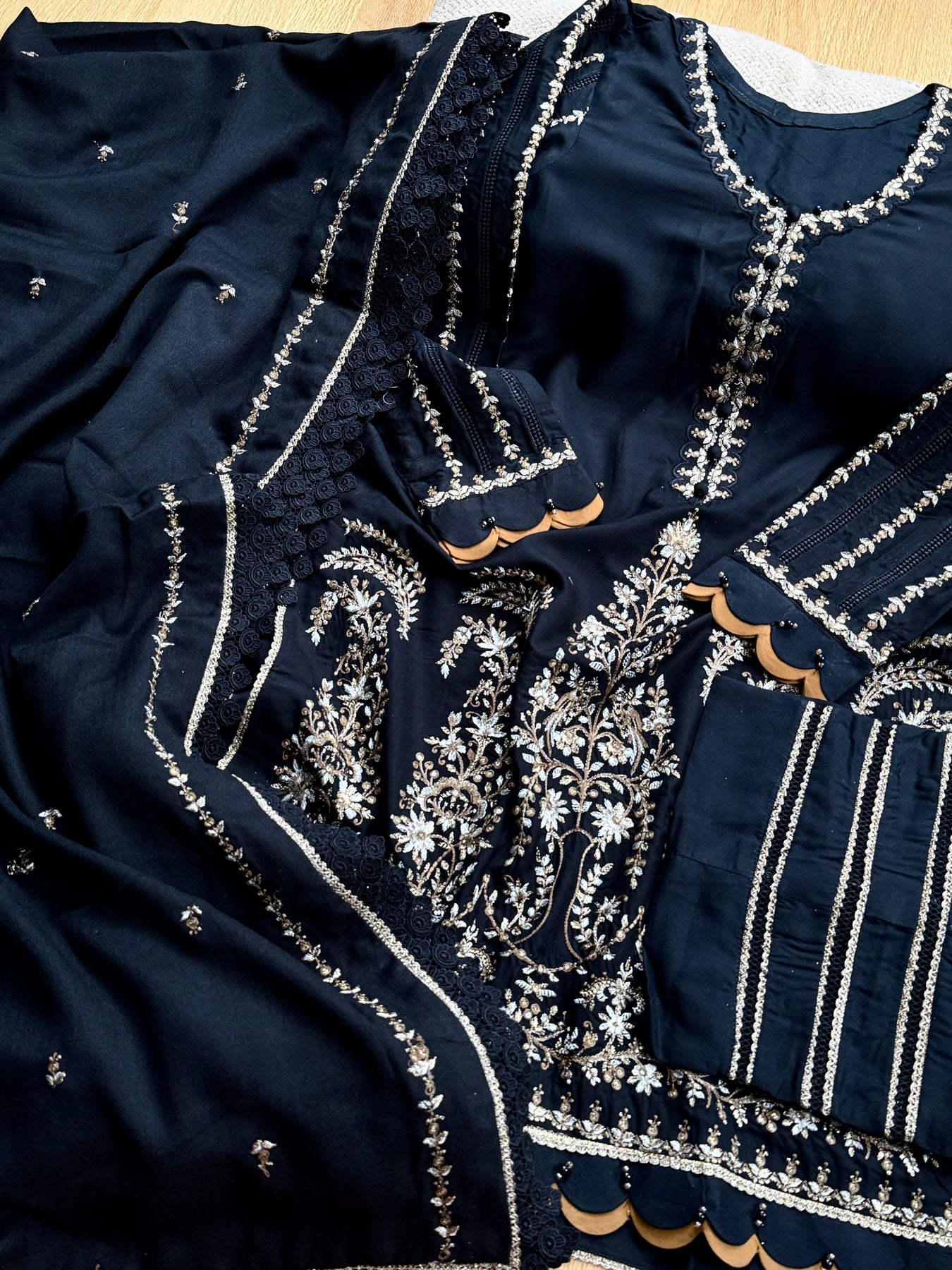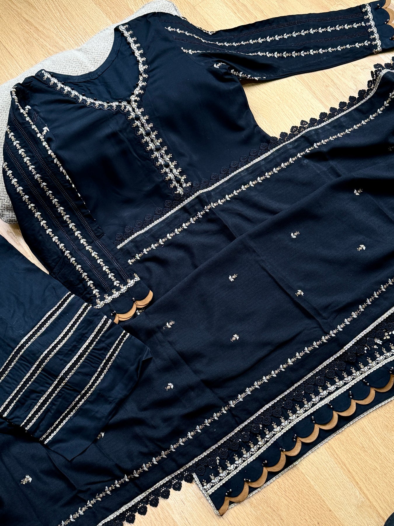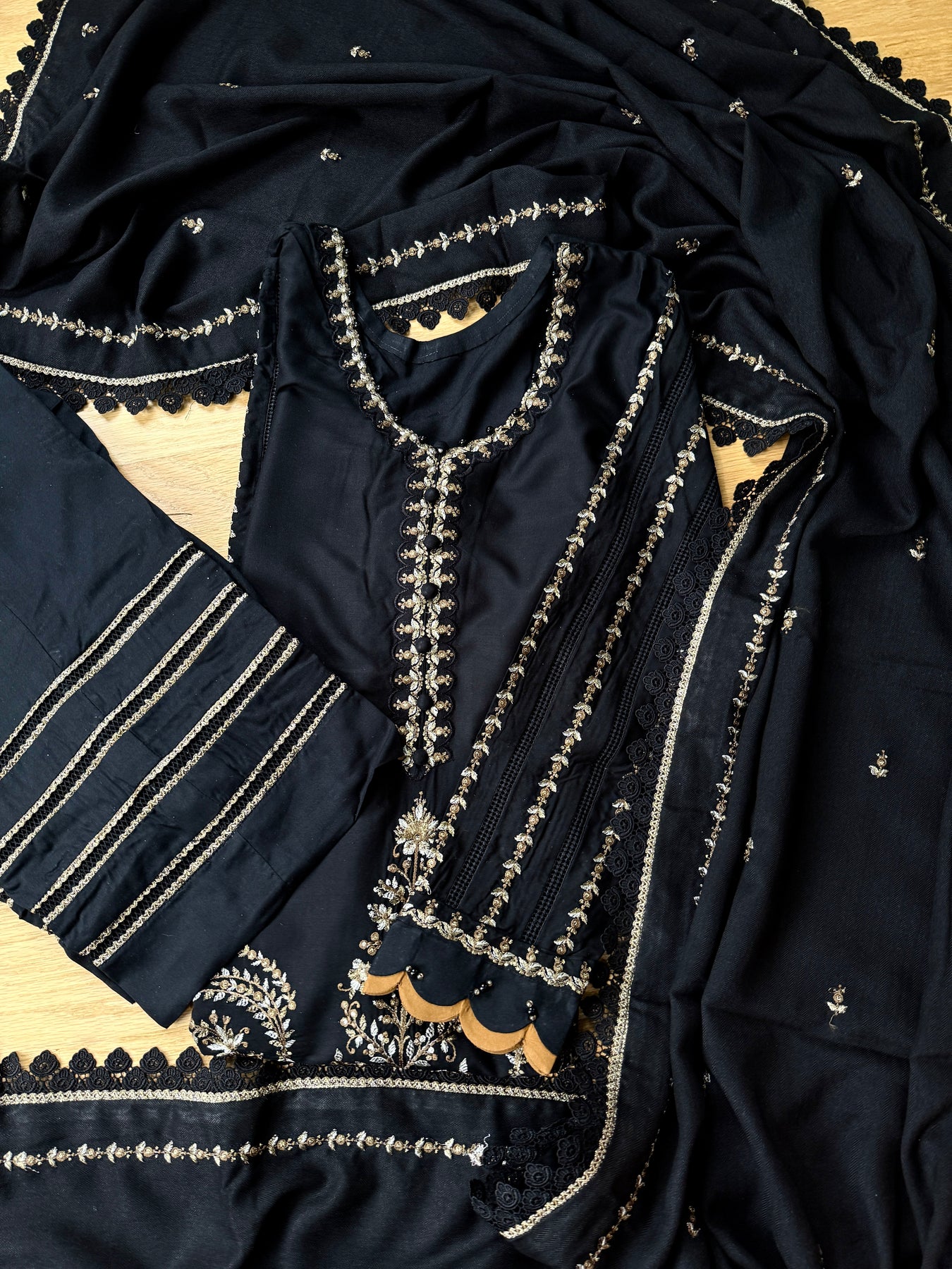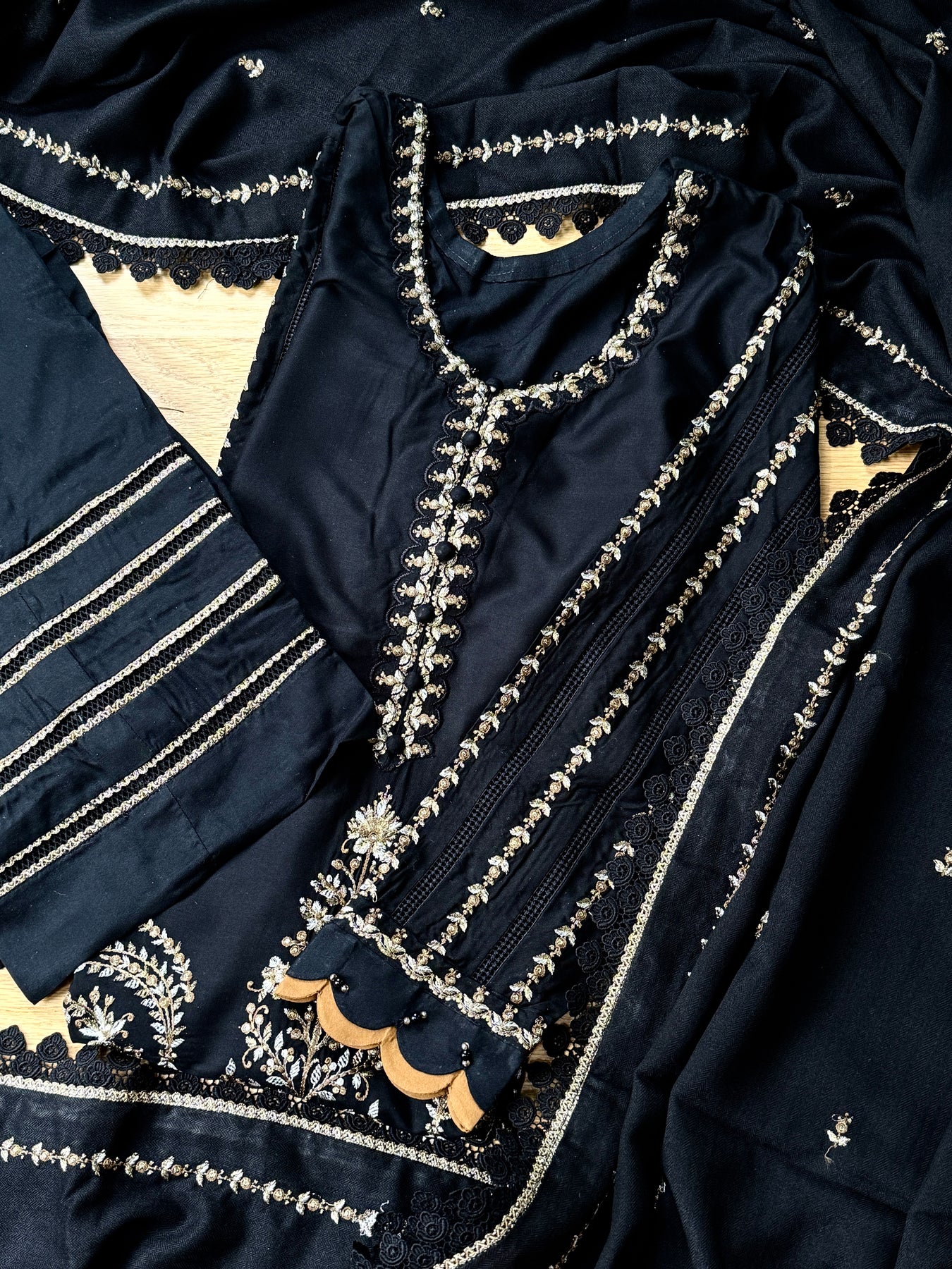 Fully embroidered linen suits with embroidered pashmina shawl.