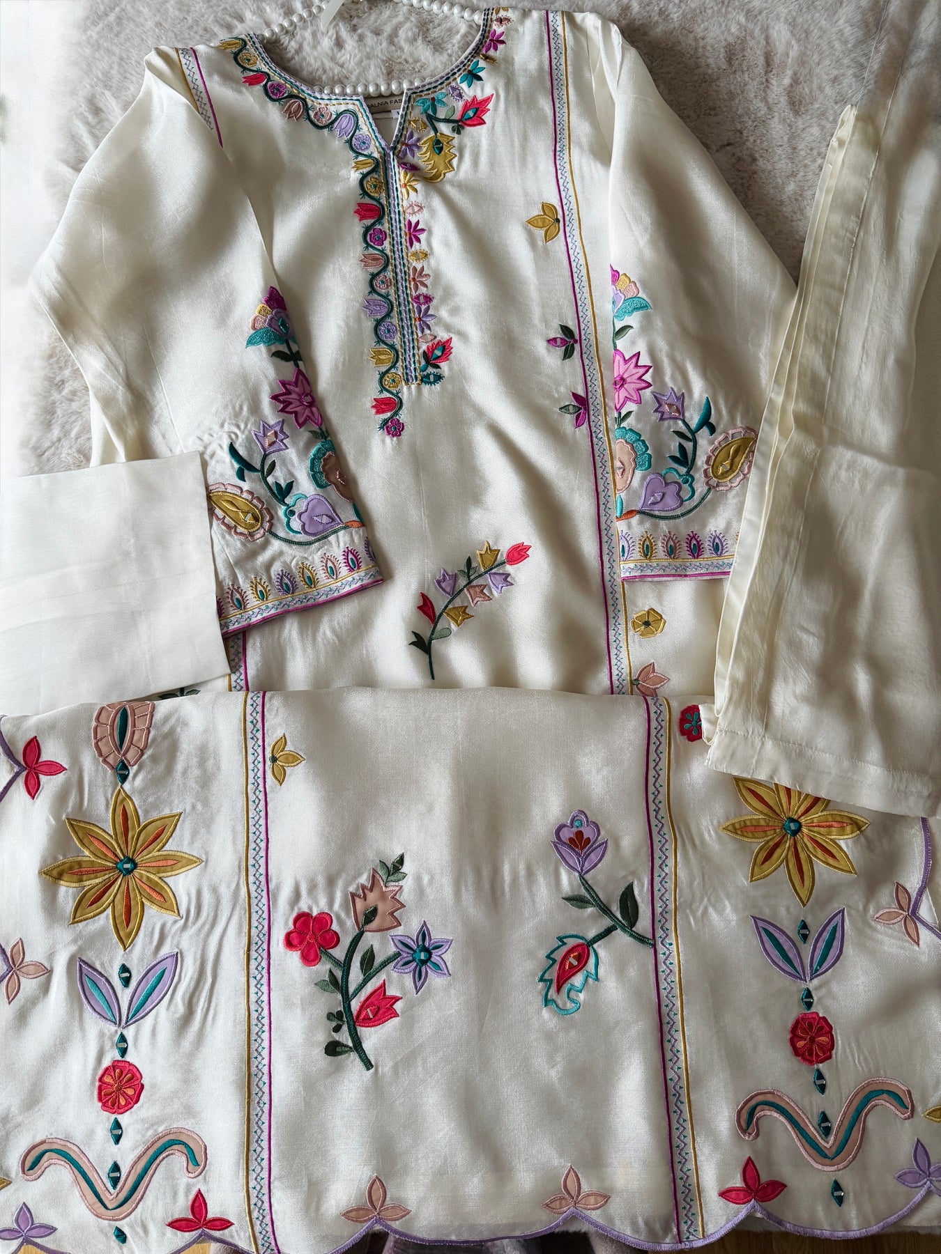 Elevate your summer wardrobe with our embroidered silk kaftans, a sophisticated blend of traditional craftsmanship and contemporary comfort. Crafted from premium sheesha silk, this kaftan features intricate appliqué embroidery plus added hand work detailing using pearls and sequins that showcases ornate detailing across the bodice and sleeves with 3-D floral detailing. The relaxed silhouette drapes elegantly, offering both warmth and graceful movement—ideal for layering or wearing as a statement piece.This versatile kaftan pairs seamlessly with coordinating accessories to complete your curated look.
