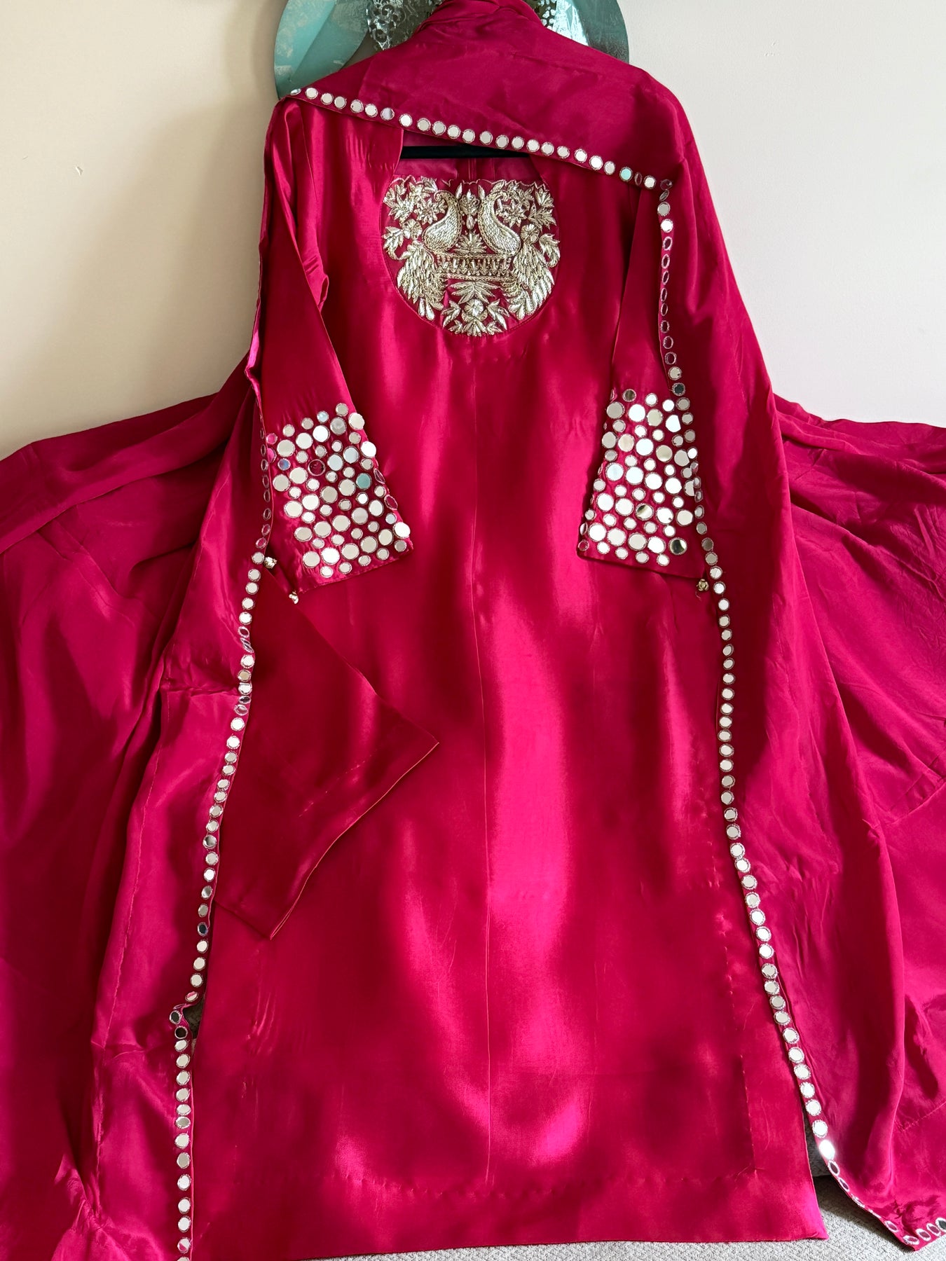 Make a stunning impression in this statement piece in pure tussel silk fabric, featuring exquisite handwork work detailing on the neck using kora,dabka,pearls and crystals that adds a touch of elegance and adding grace with heavy mirror work detailing on the sleeves. Pair it with a matching tussel silk pants and pure medium silk dupatta with heavy mirror work detailing to complete the look of this attire.