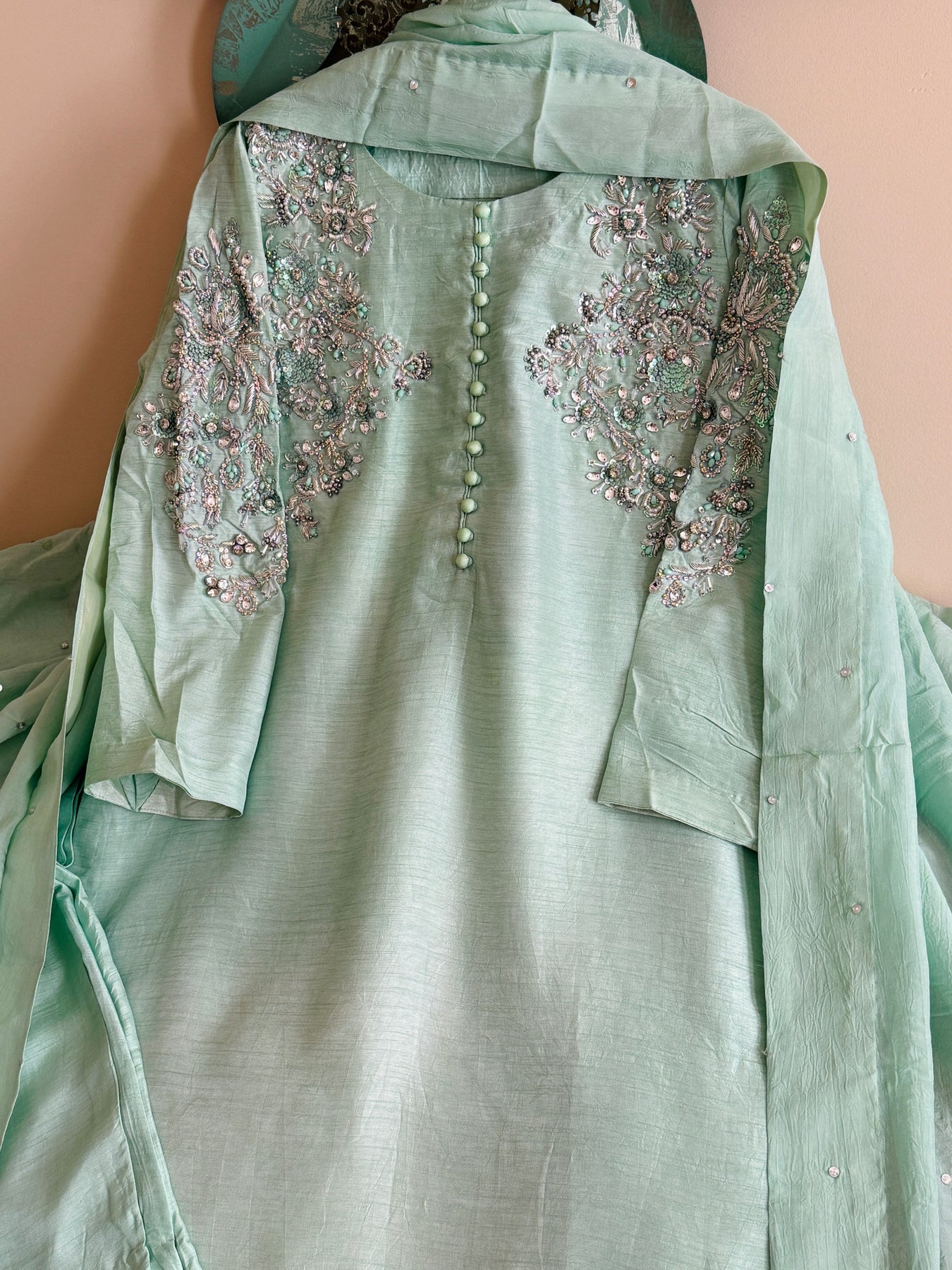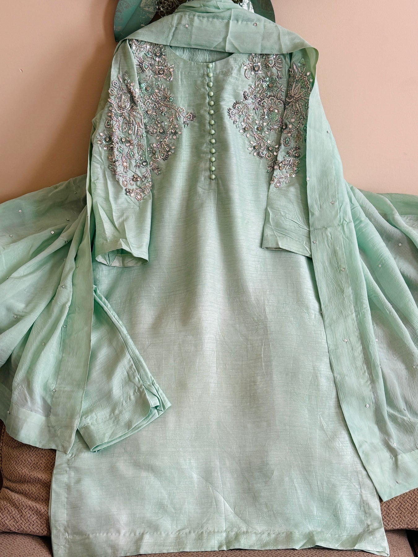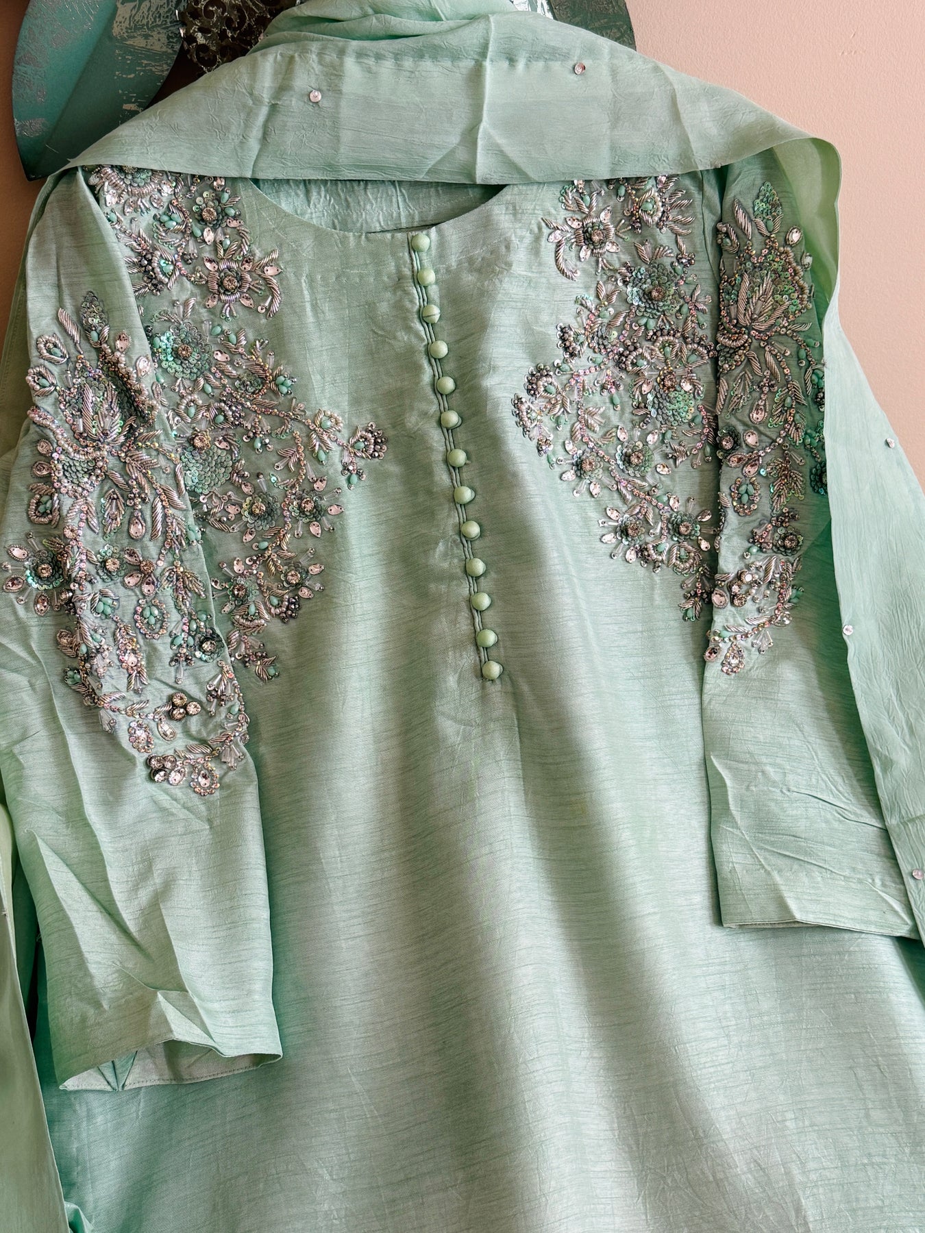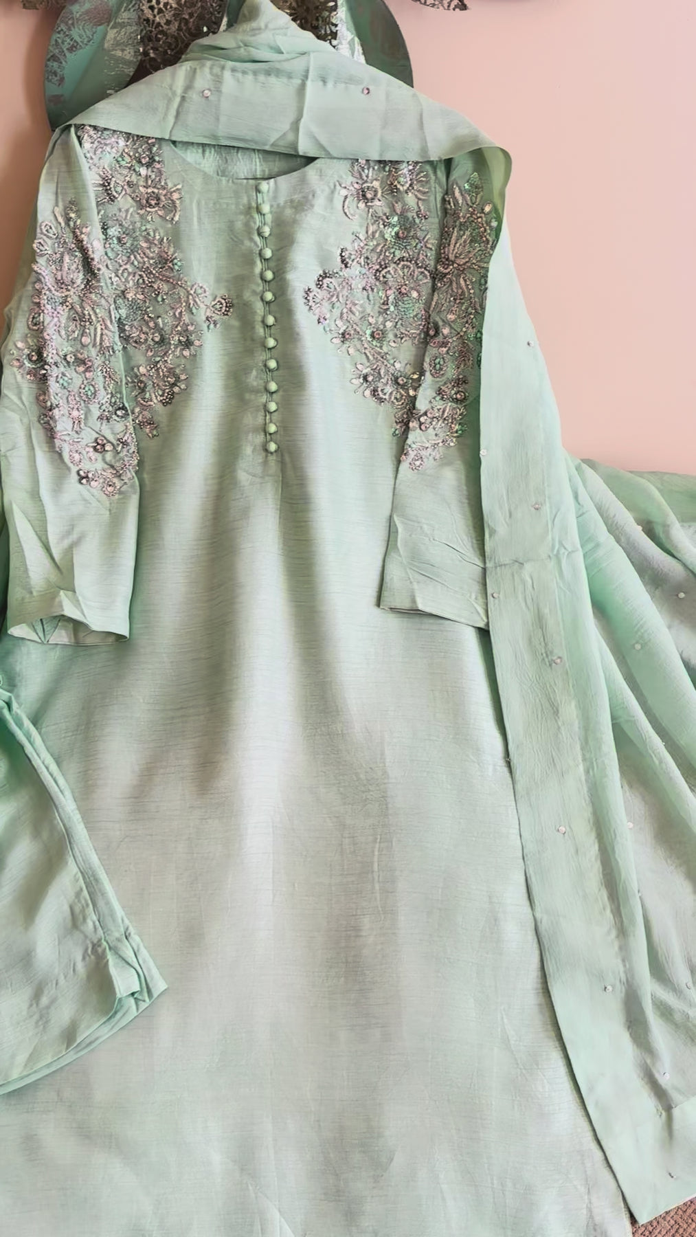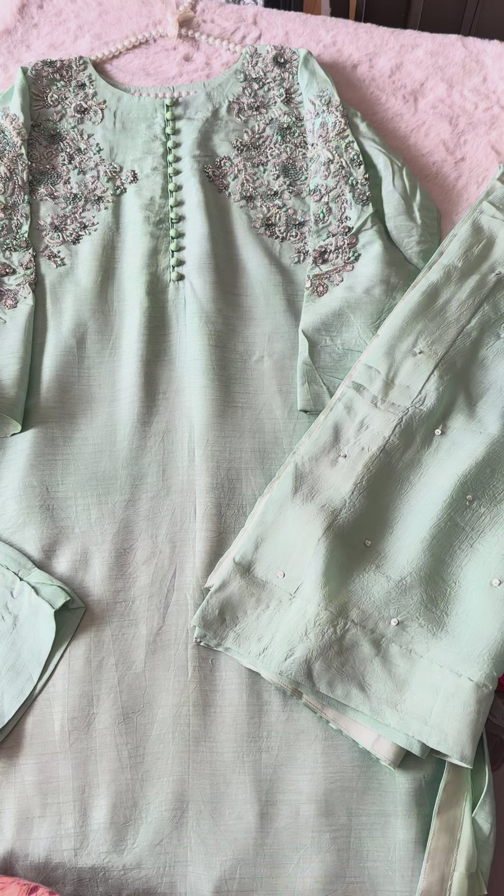 Make a stunning impression in this statement piece in Korean raw silk fabric, featuring exquisite work detailing on the neck,sleeves using kora,dabka,pearls and crystals that adds a touch of elegance. Pair it with a matching raw silk pants and medium silk dupatta with chan handwork detailing to complete the look of this attire.