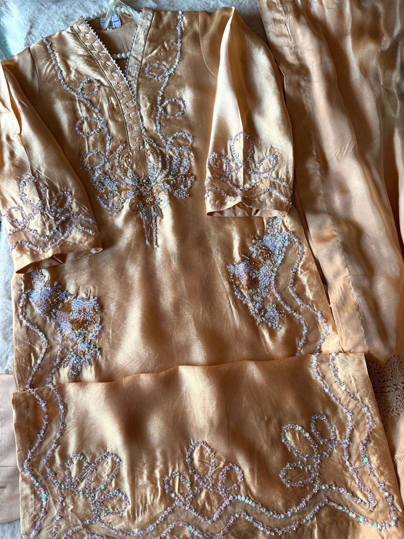 Elevate your style with this expertly muse hand-embellished shirt featuring intricate muse stone embellishments ,pearls and crystals set in a stunning appliqué cutwork using organza appliqué .The exquisite medium dupatta are adorned with a luxurious handwork silk appliqué banarasi border and delicate lace work work, and straight pure silk pants.