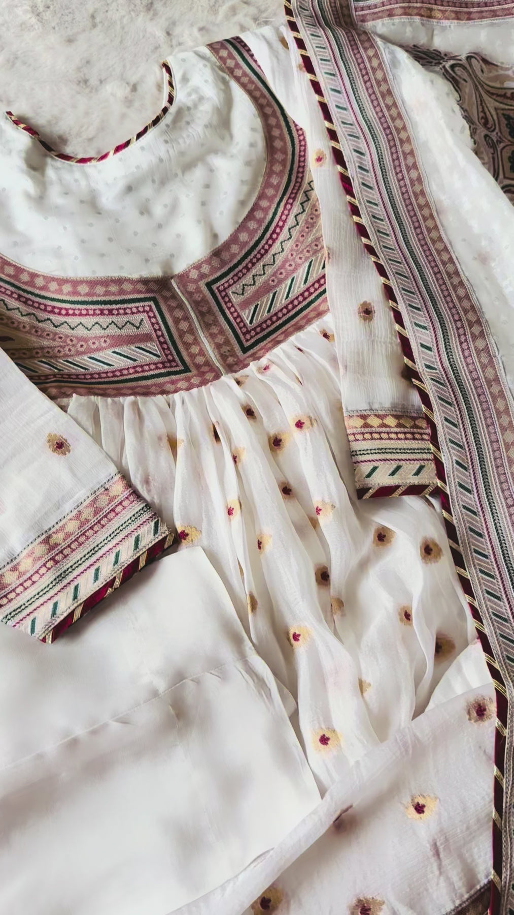 Discover the timeless elegance of this Iqbal Hussain-inspired anarkali frock, a celebration of traditional artistry and sophisticated design. Every detail speaks to masterful craftsmanship—from the intricately woven yoke and sleeves to the luxurious pure silk Banarasi panels that form the graceful silhouette. The contrasting woven border adorning the daaman adds depth and dimension, while the accompanying pure silk organza dupatta, embellished with delicate appliquéd motifs throughout, completes this three-piece ensemble. Paired with coordinating pure silk straight pants, this is a statement piece for weddings and special celebrations.