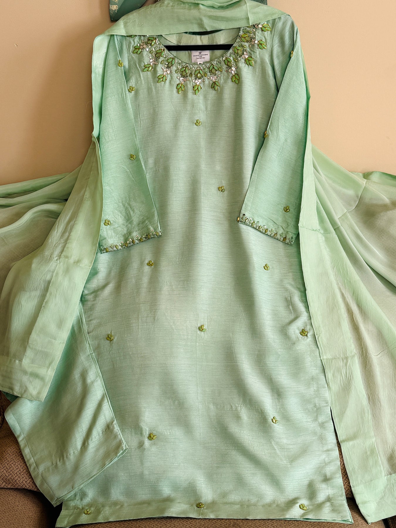 Make a stunning impression in this statement piece in Korean raw silk fabric, featuring exquisite jewel hand work detailing on the neck,sleeves and body,that adds a touch of elegance. Pair it with a matching raw silk pants and medium silk dupatta to complete the look of this attire.