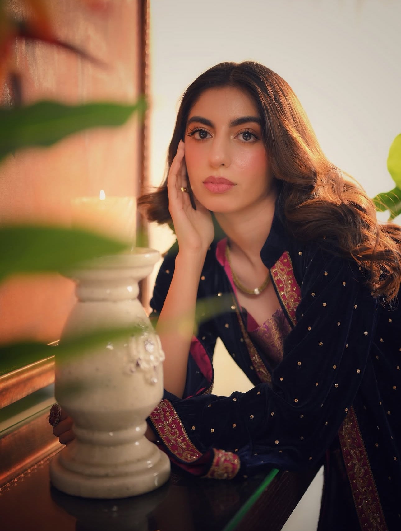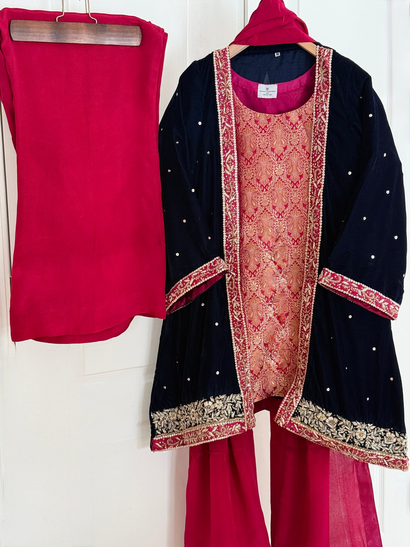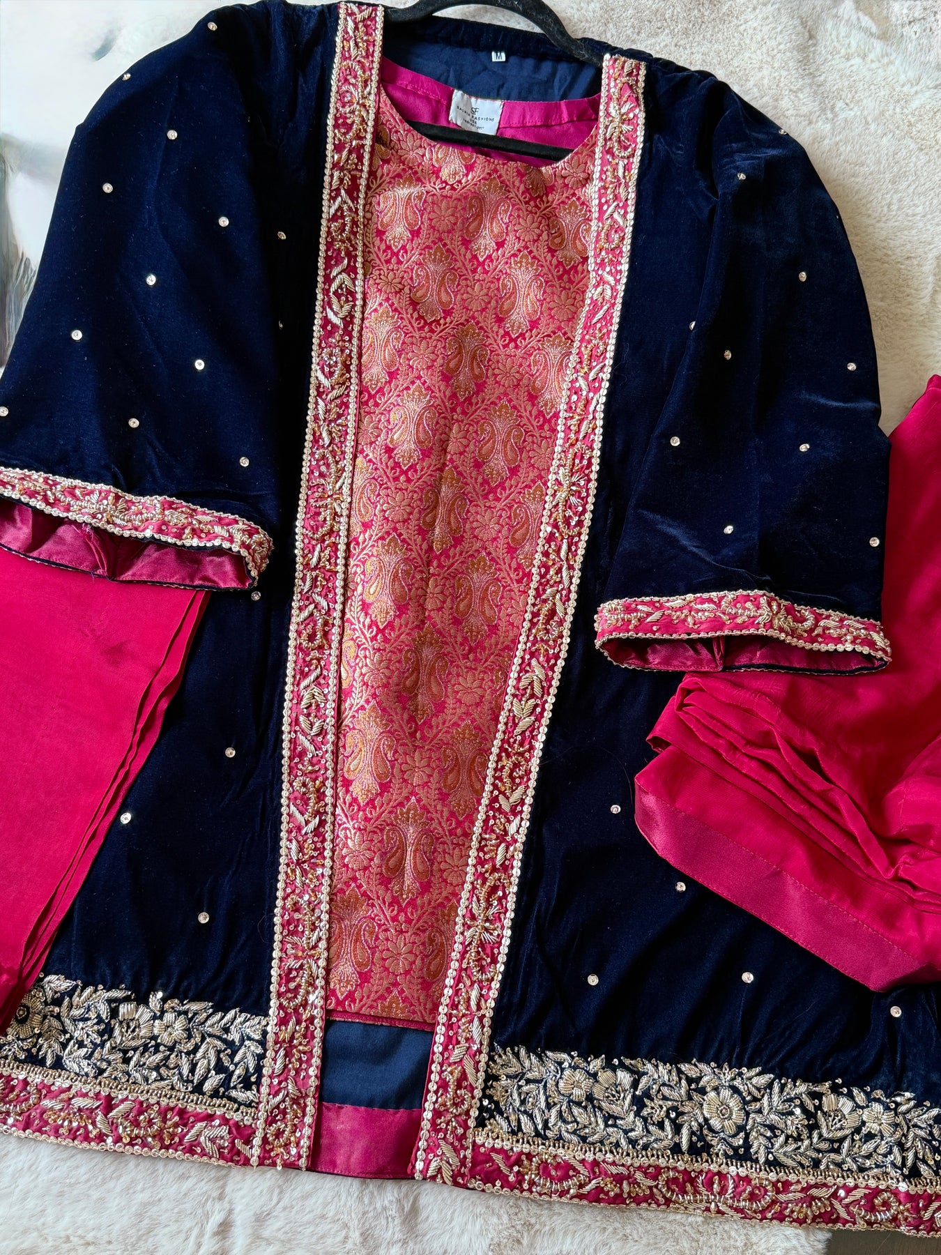 This exquisite three-piece suit showcases a velvet coat paired with a jamawar inner and wide-leg silk pants.The coat is adorned with intricate hand embroidery on the hem and sleeves, featuring traditional dabka and zardosi craftsmanship.