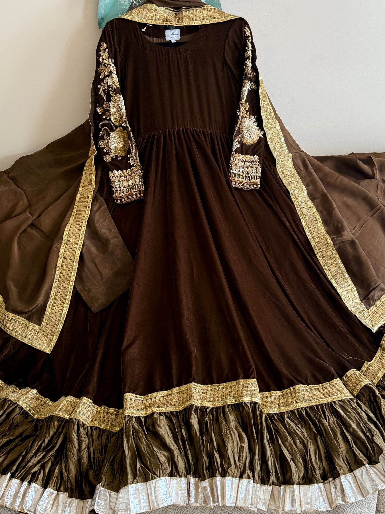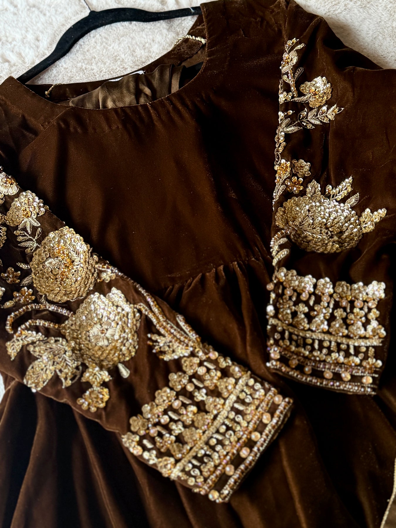 This exquisite three piece suit showcases a French velvet kalidar paired with pure medium silk dupatta and grip silk pants. The frock is adorned with intricate hand embroidery on the sleeves featuring traditional dabka,pearls,crystals and zardosi craftsmanship.