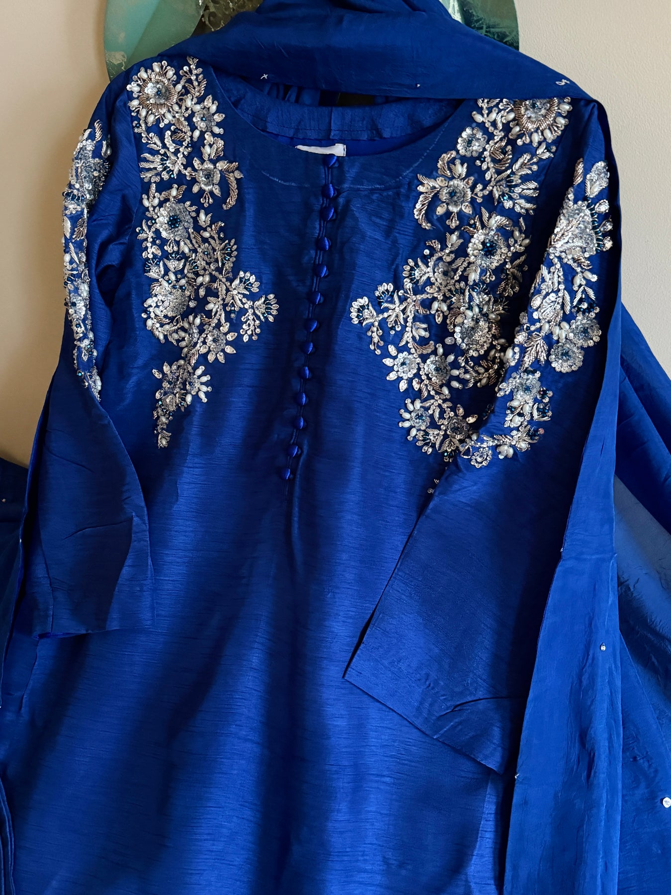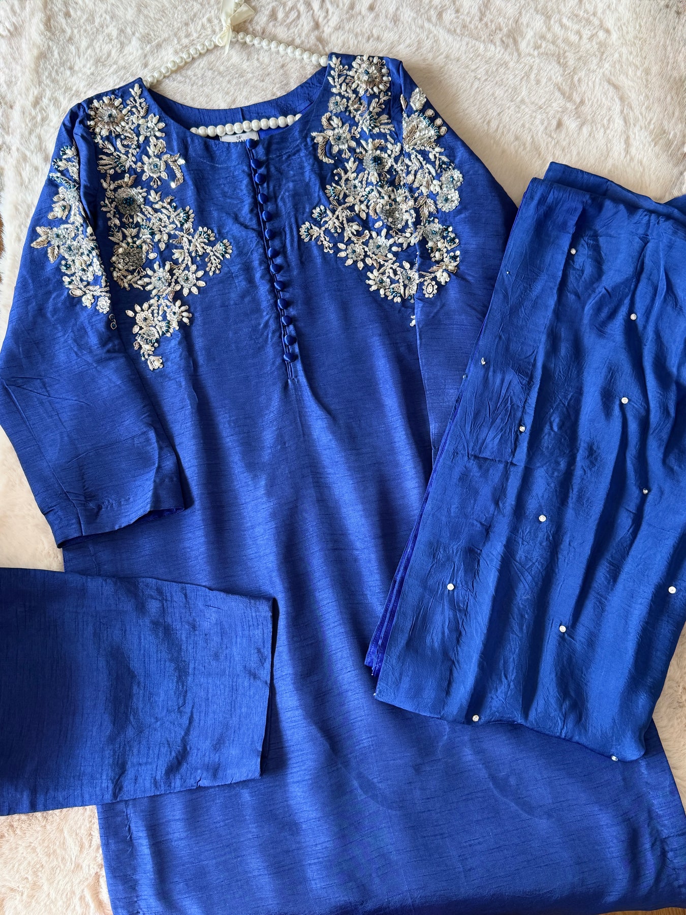 Make a stunning impression in this statement piece in Korean raw silk fabric, featuring exquisite  work detailing on the neck,sleeves using kora,dabka,pearls and crystals that adds a touch of elegance. Pair it with a matching raw silk pants and medium silk dupatta with chan handwork detailing to complete the look of this attire.