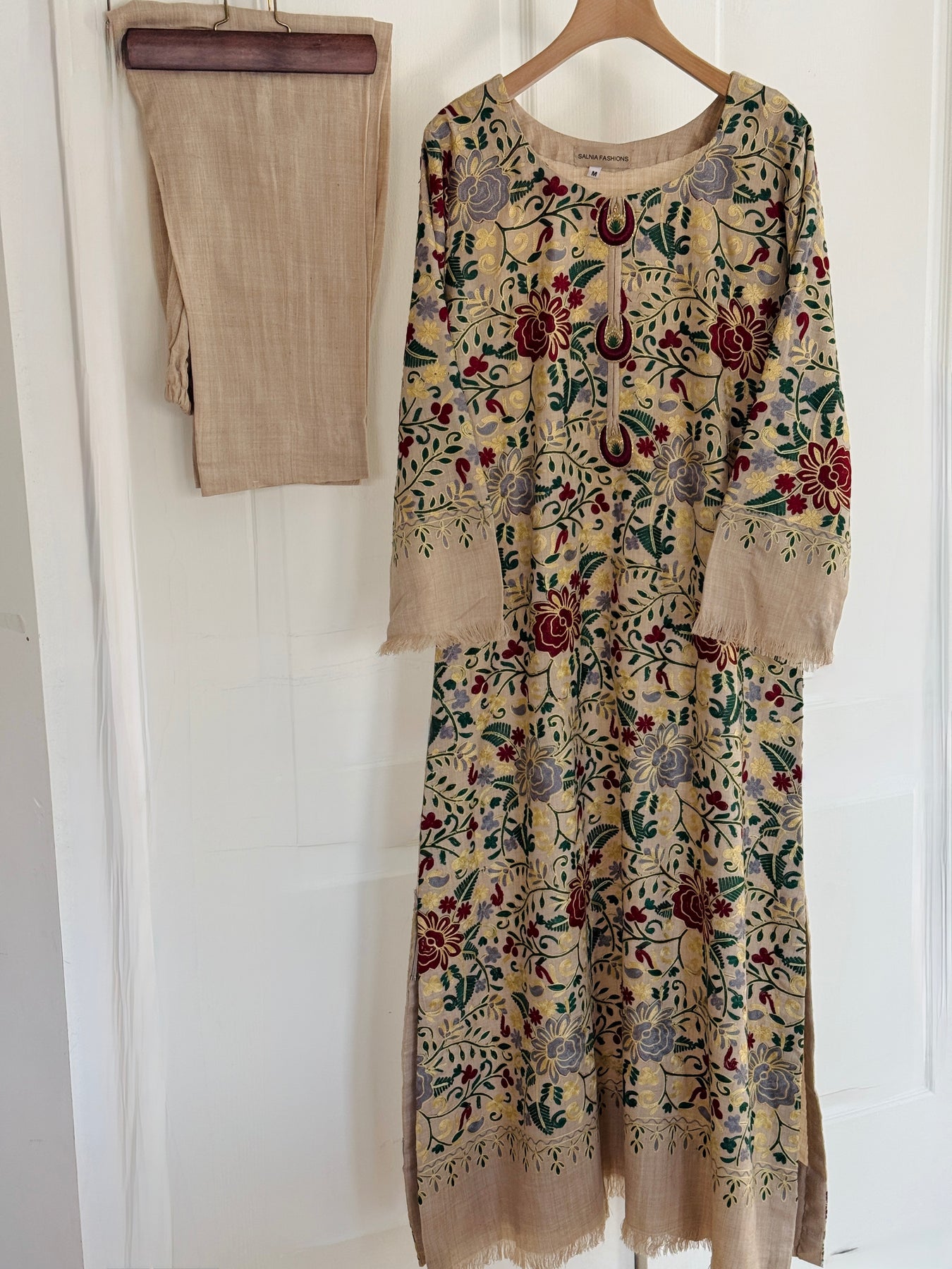 Elevate your winter wardrobe with our embroidered pashmina kaftans, a sophisticated blend of traditional craftsmanship and contemporary comfort. Crafted from premium pashmina, this kaftan features intricate aari embroidery that showcases ornate detailing across the bodice and sleeves. The relaxed silhouette drapes elegantly, offering both warmth and graceful movement—ideal for layering or wearing as a statement piece.This versatile kaftan pairs seamlessly with coordinating accessories to complete your curated look.